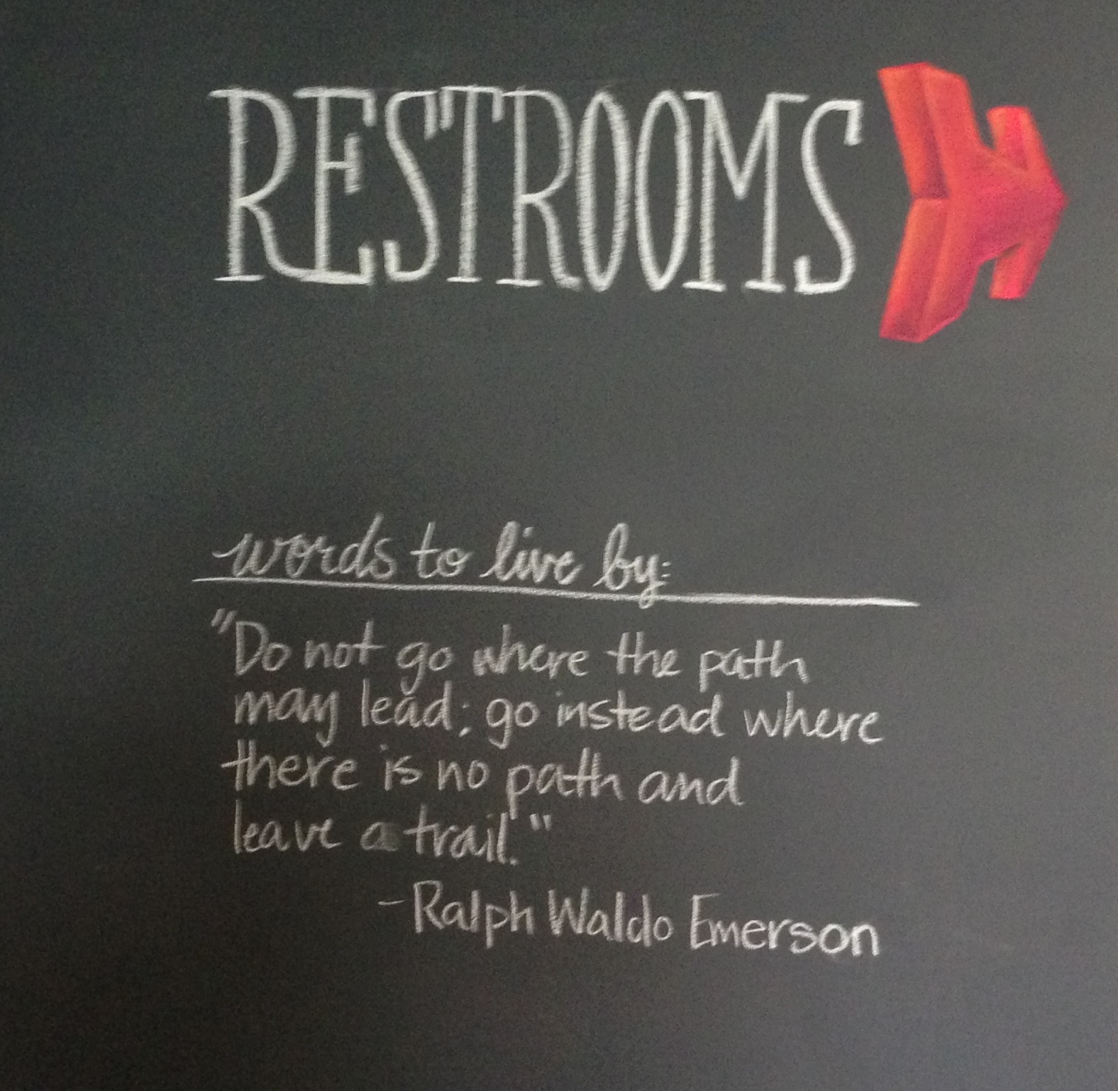 Something about the juxtaposition of the “this way to the bathrooms” and the Emerson quote kicks over my giggle box. I mean, what is the message they’re trying to send here: don’t follow the path to the men’s room, but instead go outside and…shall we say, leave a trail to mark your territory?