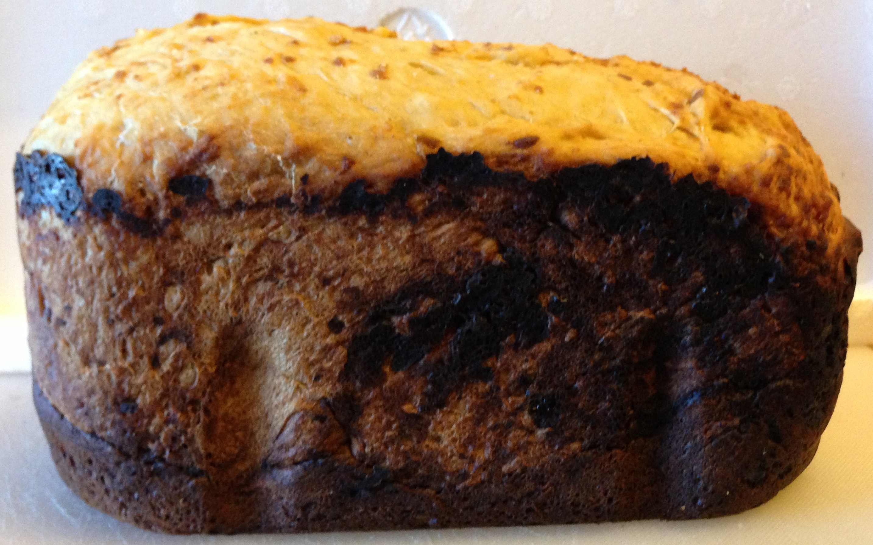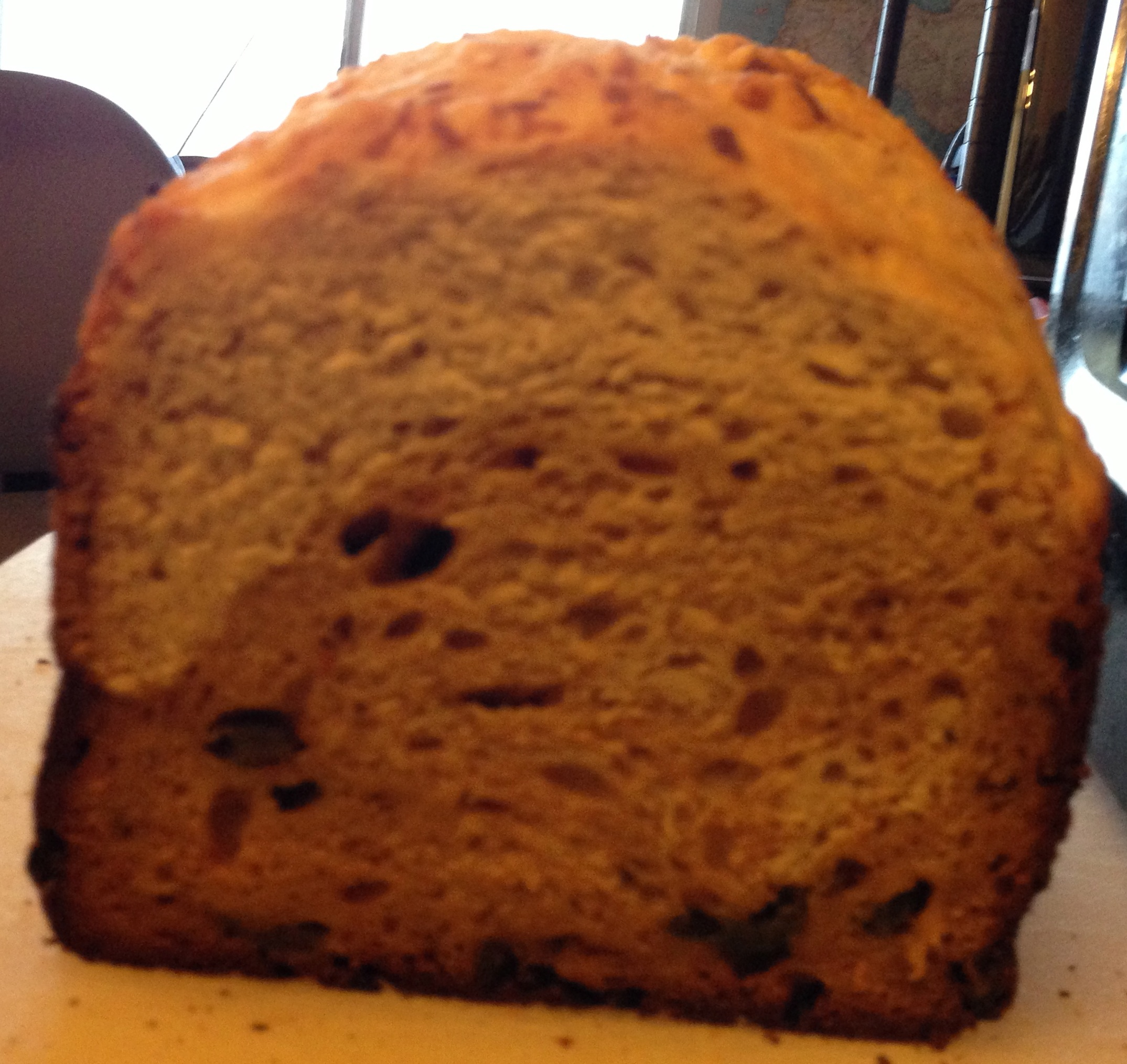 Good even texture on the loaf. No gigantic holes or anything like that. Notice the color striation; I think that’s from the cheese mostly settling to the bottom of the loaf.