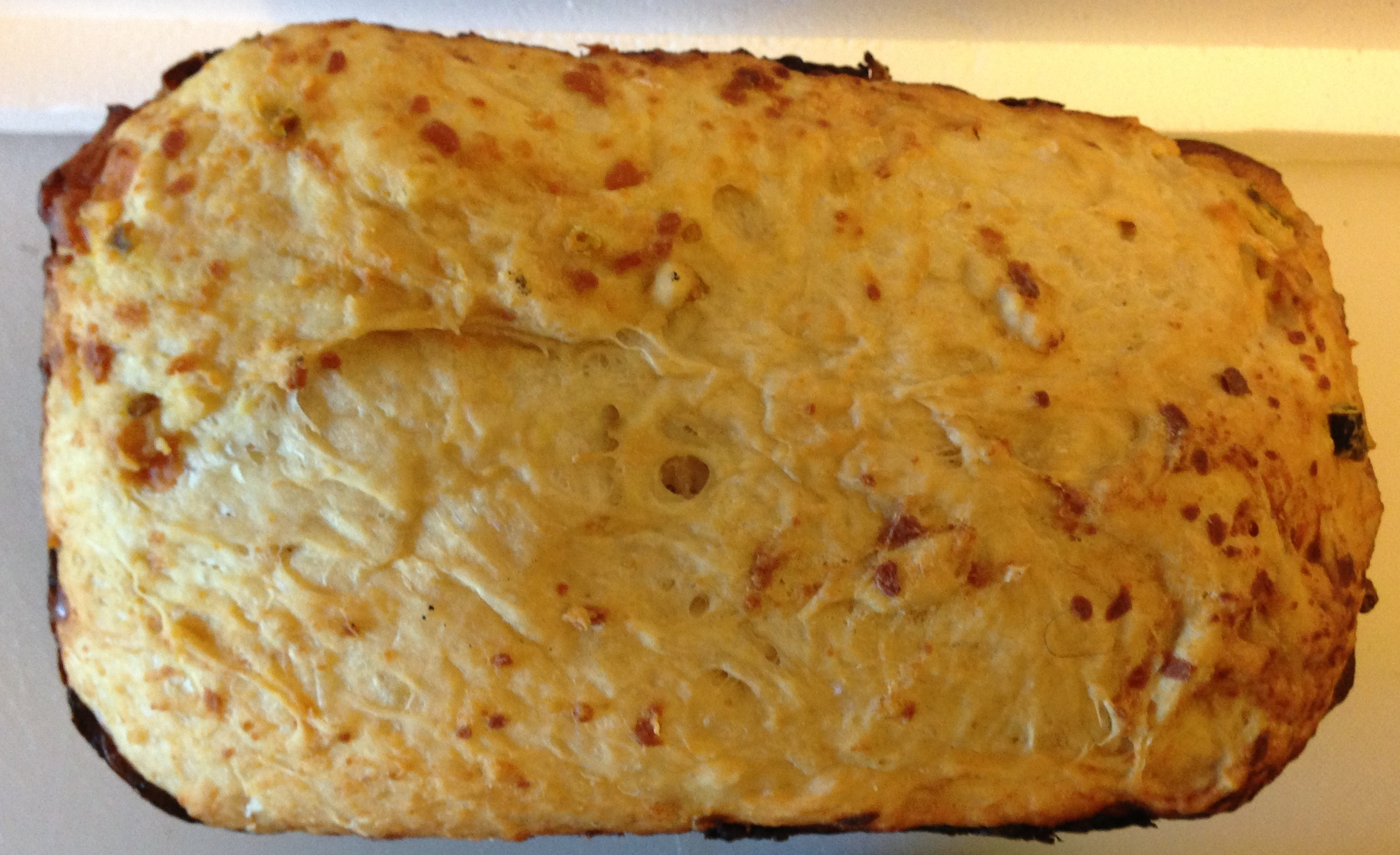 And how does it taste? Well, this was a surprise: it tastes really, really good. If I had been working from a recipe, I’d be happy with the way it came out; given that this was an improvised bread, I’m even happier. It has a nice jalapeño tang to it, but not an overwhelming one. The cheese gives it some good body and a subtle background taste, too. I cooked up some more of the meat that was in my freezer and ate it with several slices of this bread. The two go very well together.