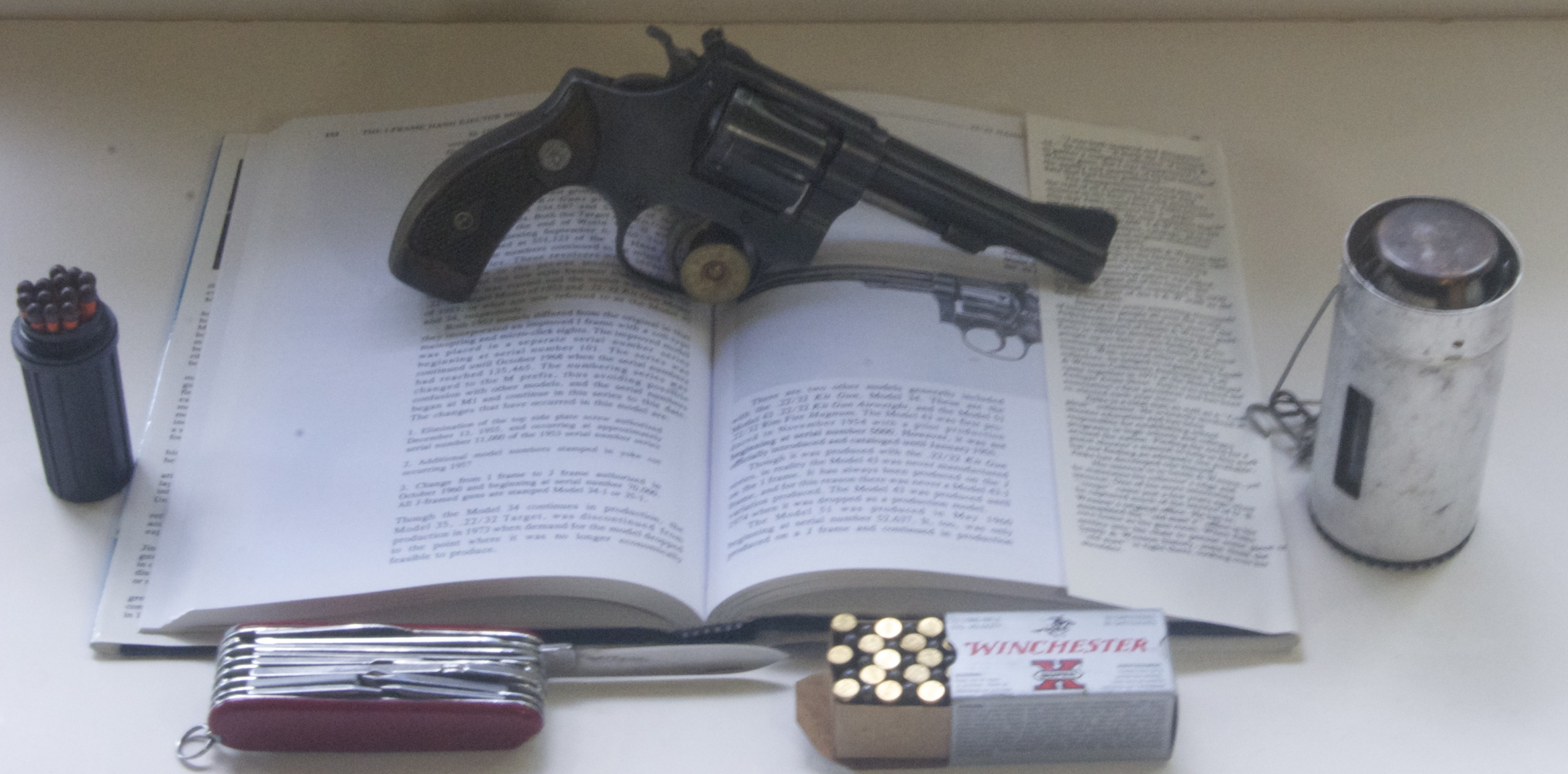 (Swiss Army knife by Victorinox. Candle lantern by REI. .22 LR ammo by Winchester. Matches by someone else.)