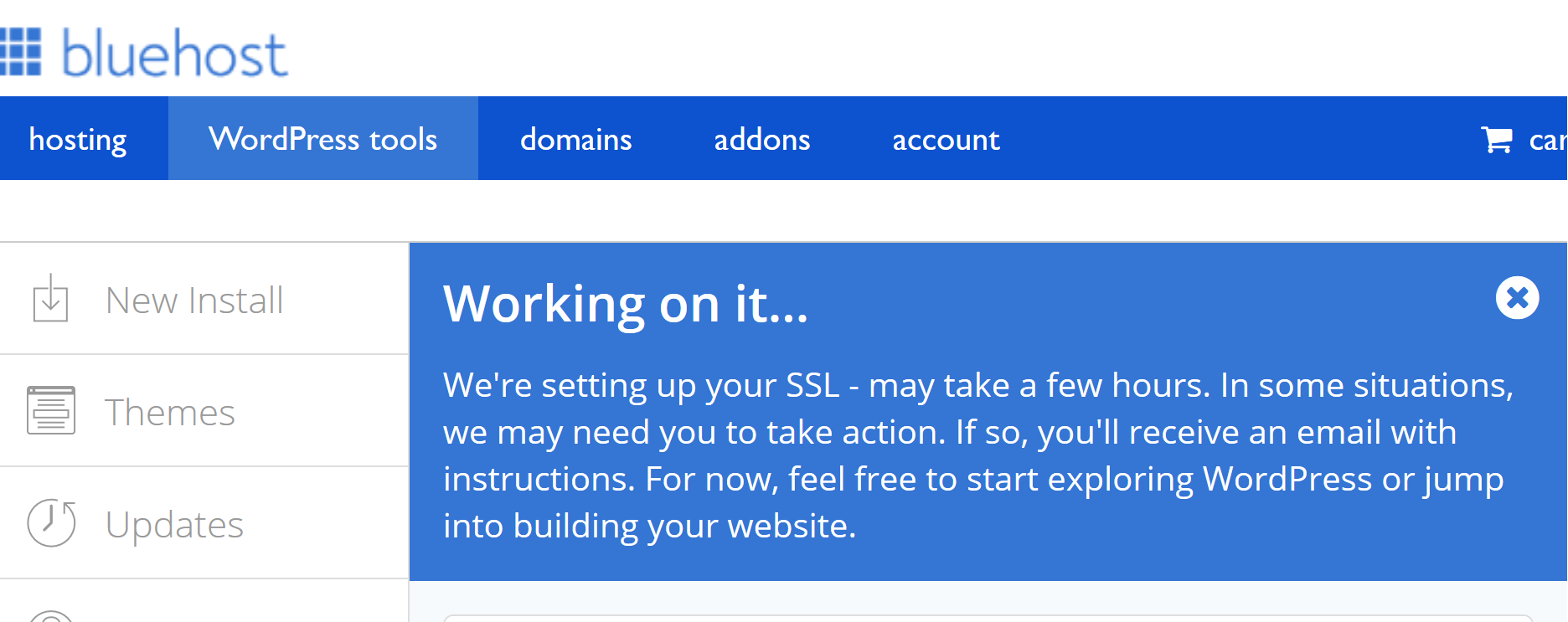 It’s been like that all morning. I haven’t opened a ticket with Bluehost yet, as I figure if Bluehost is having an issue, they’re probably already aware of it. If this continues through tomorrow, I’ll contact their support.