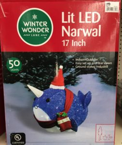 Spotted at a Big Lots over the weekend. Mike the Musicologist and I are thinking you could do a holiday special about a narwal: all we need is a name, and then we can write the script.