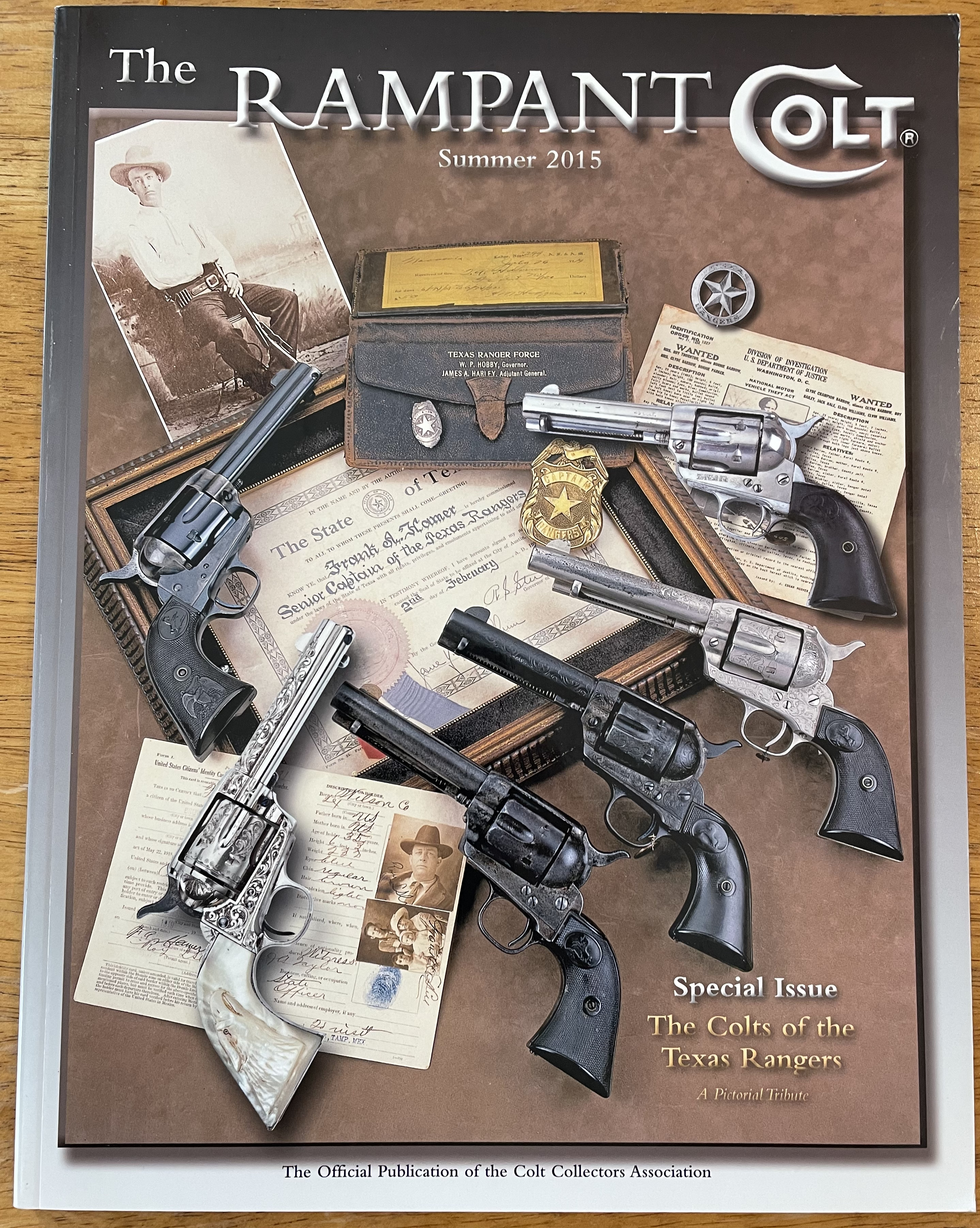 “The Rampant Colt”, Summer 2015. “The Rampant Colt” is the official publication of the Colt Collectors Association, which I am not a member of (yet). A dealer had a stack of back issues on his table, and I flipped through them looking for a specific one. Didn’t find it, but I did find this issue, which is devoted to “The Colts of the Texas Rangers”. And yes, it has many photos with short write-ups of Colts belonging to famous Texas Rangers. For example, there are four pages featuring Frank Hamer‘s Single Action Army revolvers. Purchased for $3, and worth every penny.