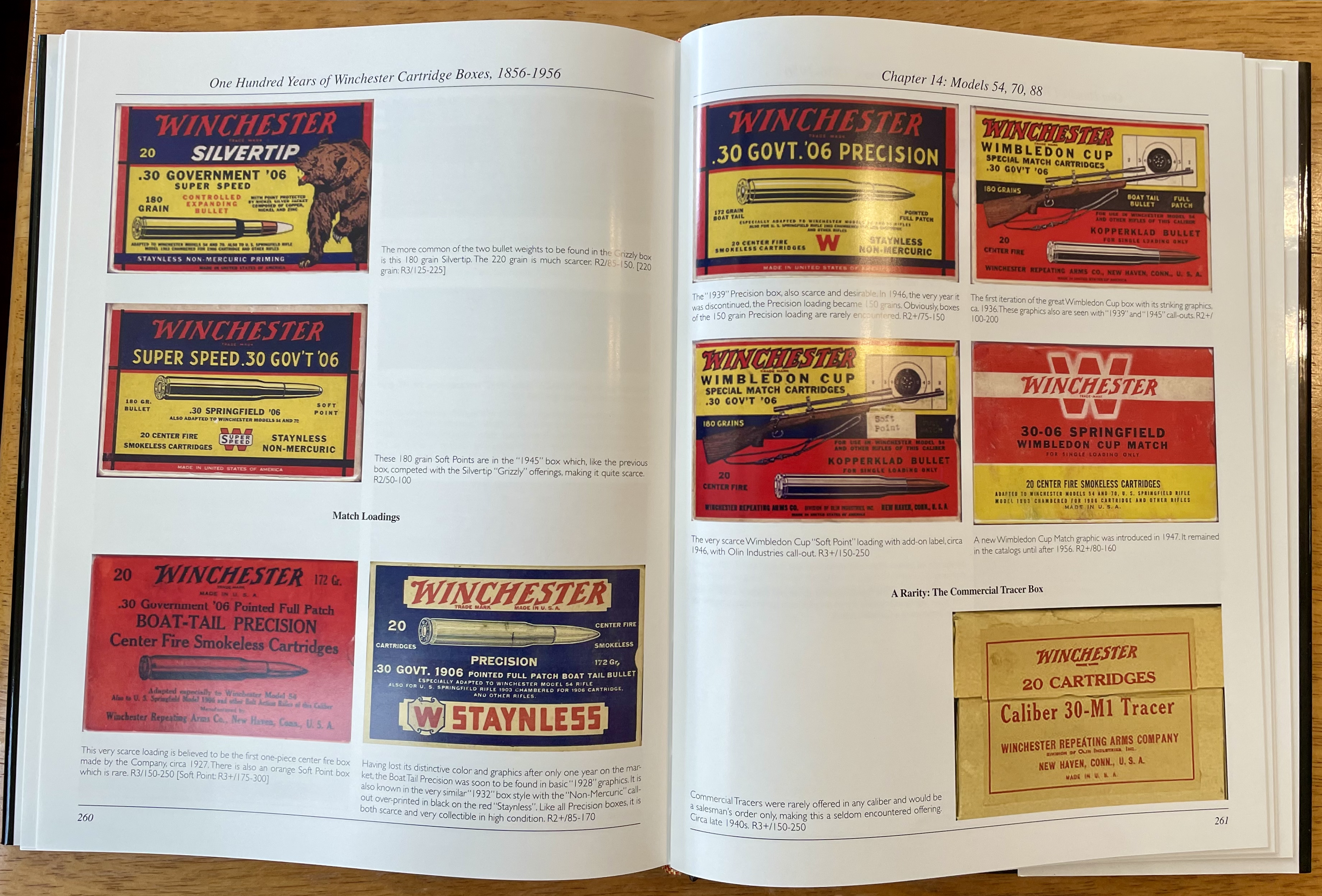 The book is exactly what it says on the tin: a copiously color illustrated and nicely put together collection featuring Winchester cartridge boxes between those two dates, organized by rifle make and model, and then by caliber within sections. For example, here’s two pages from the section on the Model 54, Model 70, and Model 88 with boxes for the .30-06 Winchester caliber. (I think my use of a single spread from the book, which is 312 pages total, can be called fair use.)