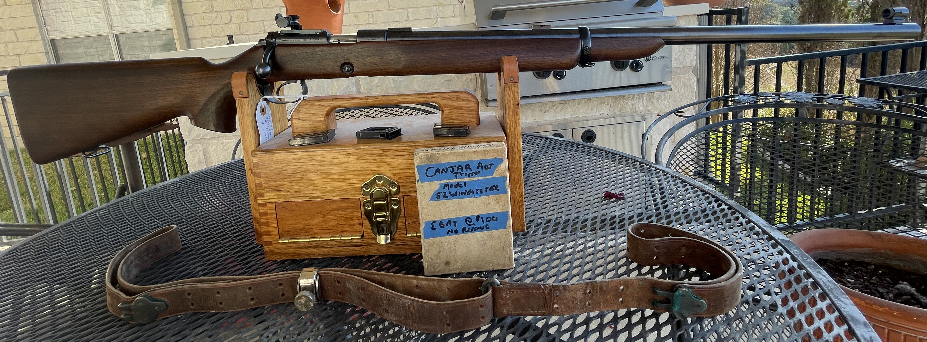 Winchester Model 52 heavy barrel. Shown: sling, trigger, 5-round magazines and single shot adapter.