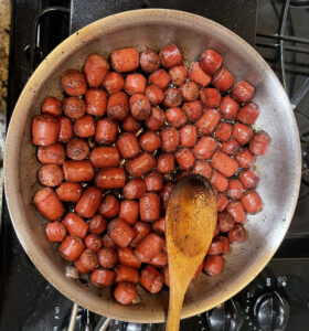 - My proportions were off. I could only find 12 ounce packages of (Nathan’s) skinless franks, so I used two of those. Which is 24 ounces, or less than two pounds.