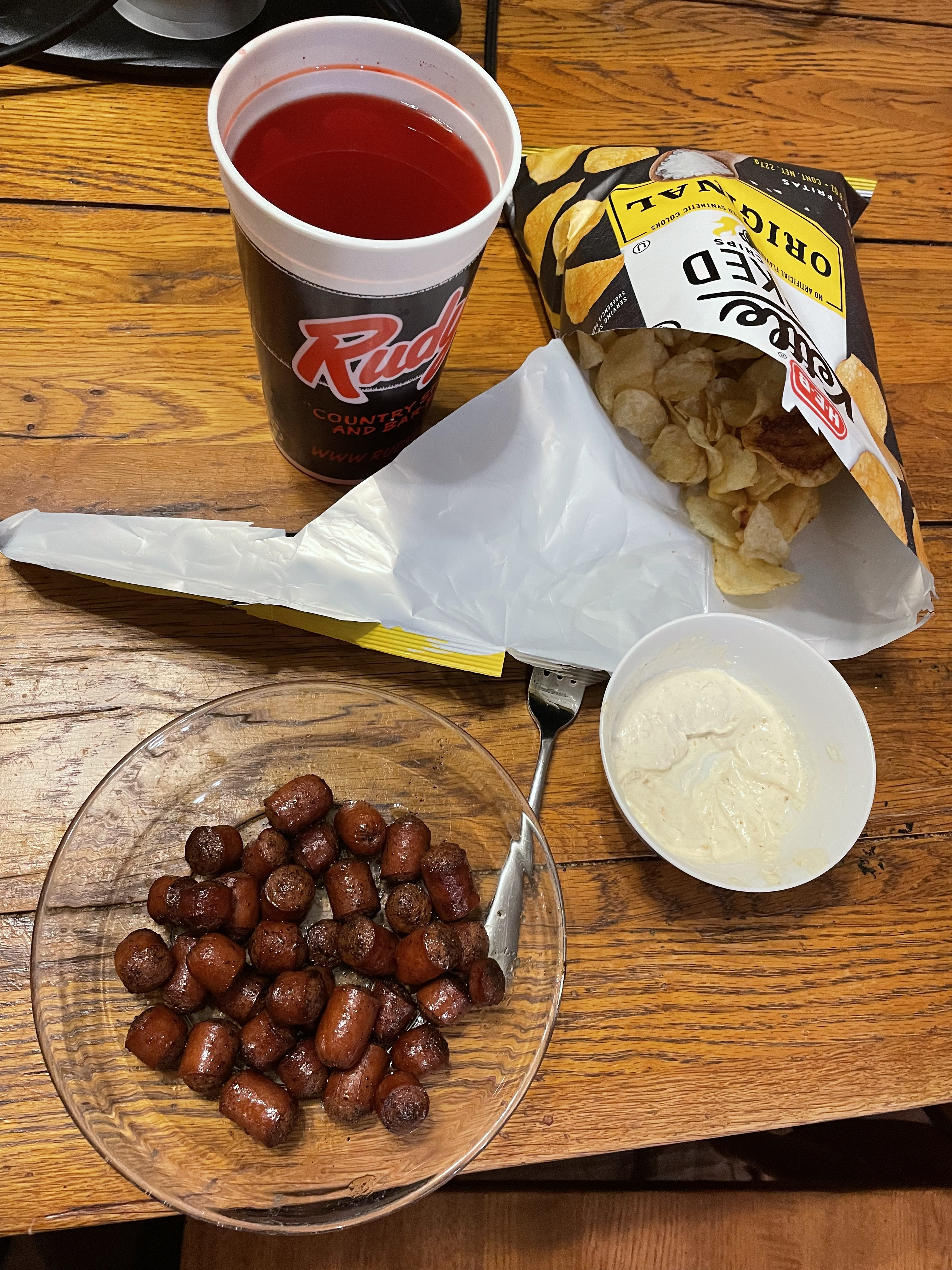 Cocktail franks using a recipe from Vincent Price, reproduced on the Silver Screen Suppers blog. I’ve had a craving for these ever since I read the recipe, and this was my chance.