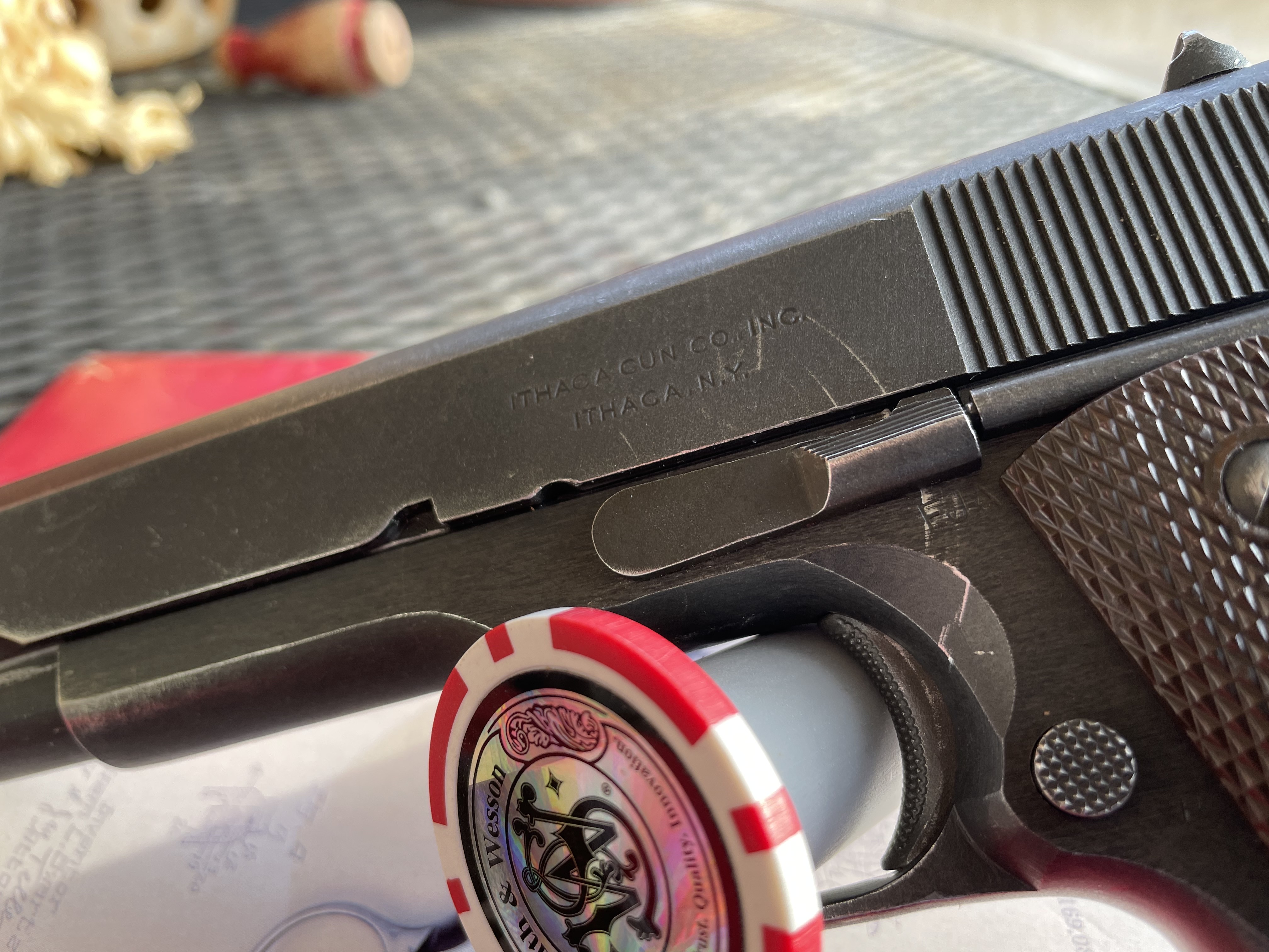 Closeup of the “Ithaca Gun Co. Inc.” marking on the slide. This gun was probably serviced, and the slide replaced, by an armorer at some point. The gun doesn’t rattle: the slide seems tight, and could probably use a few drops of strategically applied oil. (When I have some time, I plan to field-stip and lube the gun following Bill Wilson’s recommendations.)