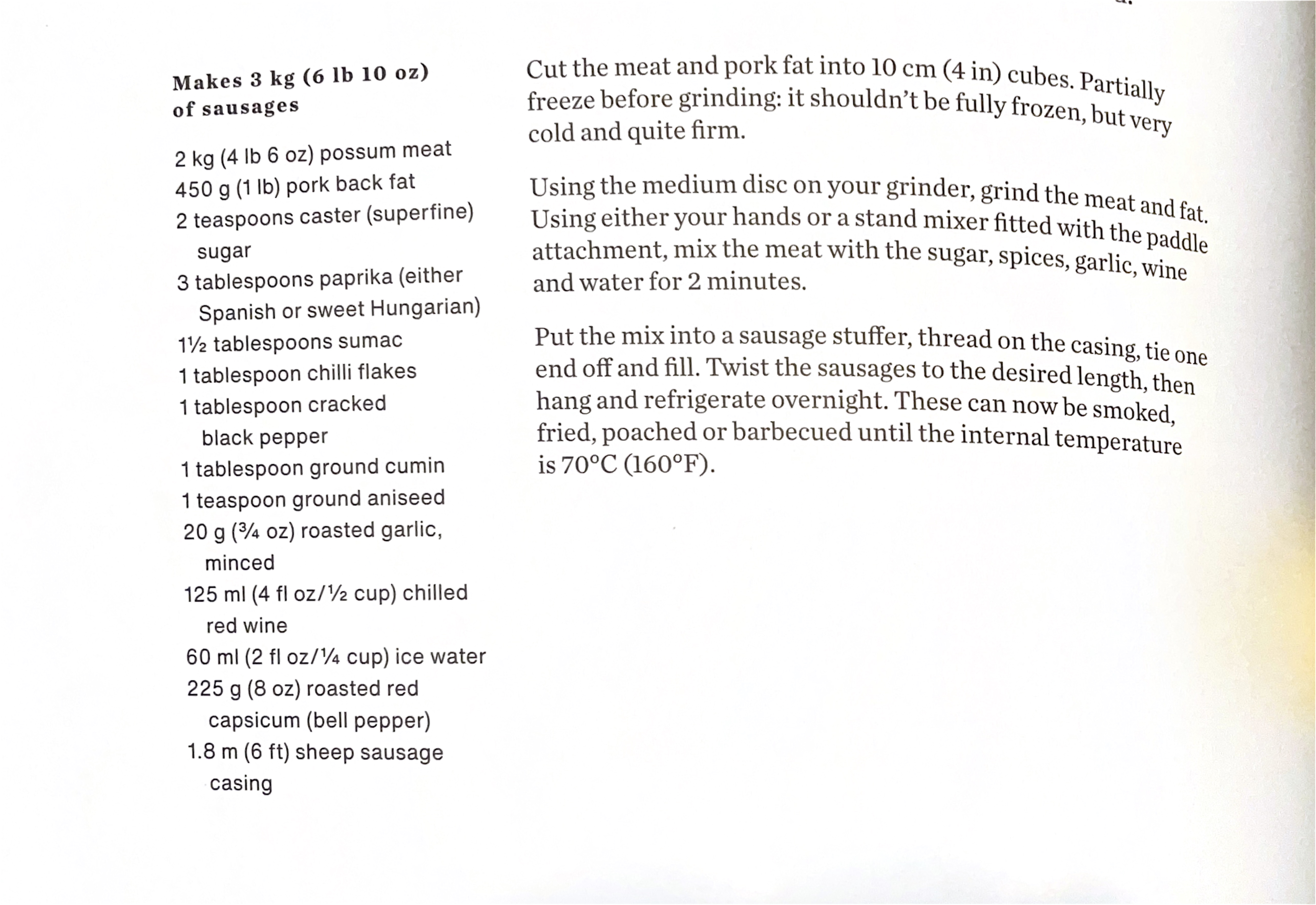 I do not know if the differences between Didelphimorphia and Diprotodontia make a difference to the cooking time or the taste of the possum sausage. I have not tried this recipe yet. (We don’t have a sausage/meat grinder. We do have a Kitchenaid stand mixer, but I would never buy the sausage stuffer attachment for it, as reliable sources say that is a POS.)