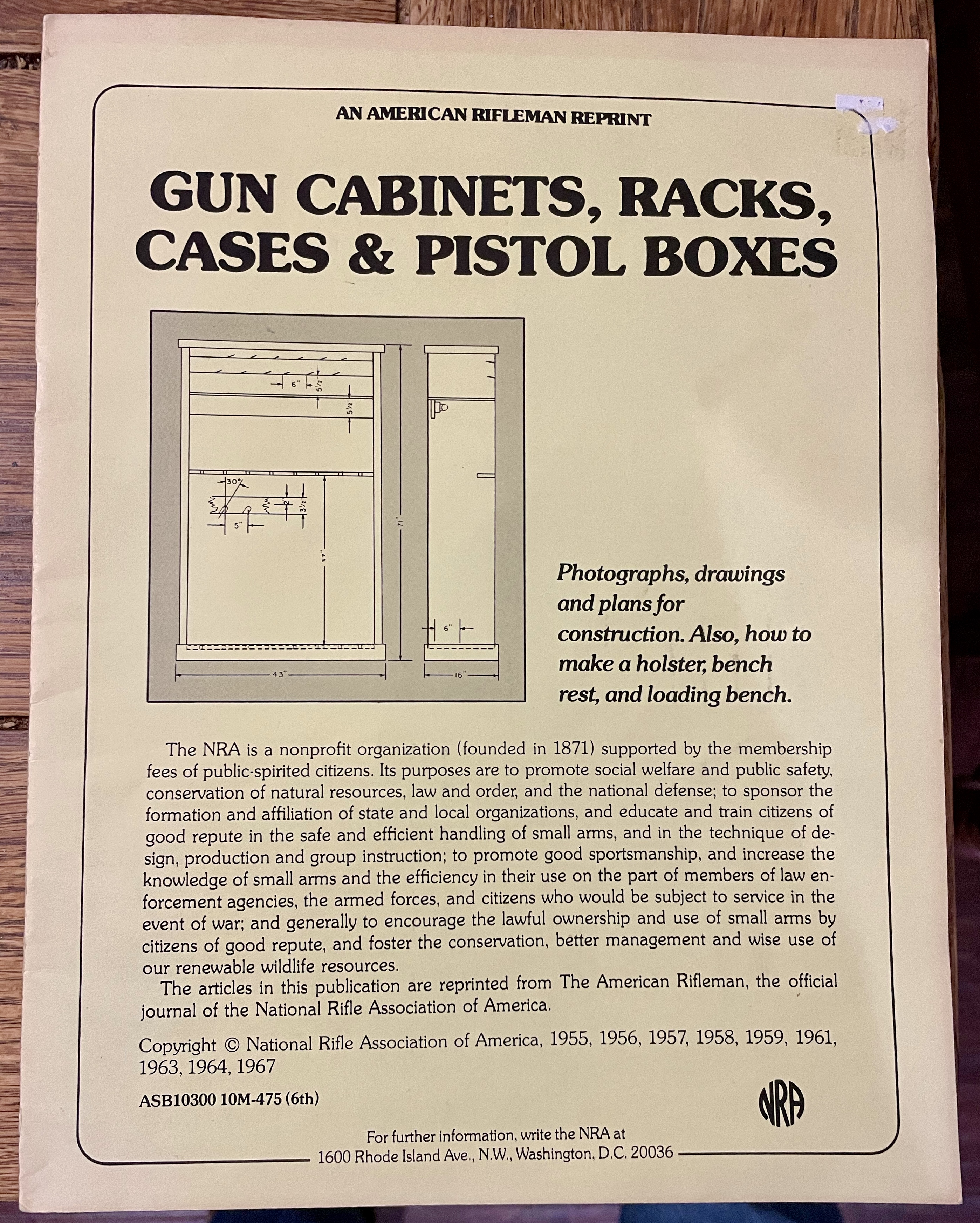 An American Rifleman Reprint: Gun Cabinets, Racks, Cases & Pistol Boxes, National Rifle Association, Washington, DC, 1967.