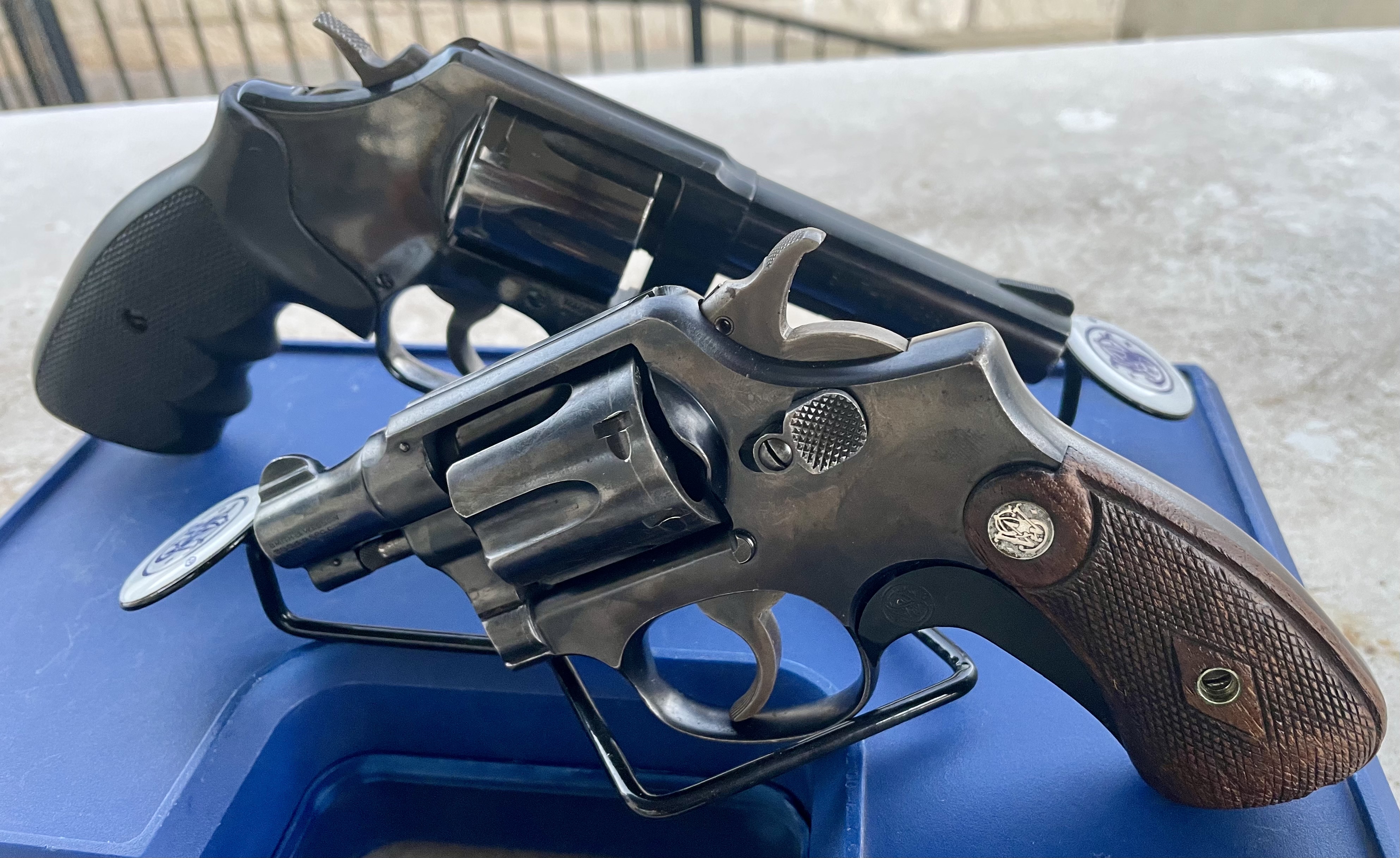 The one in front is a post-WWII M&P shipped in October 1947. The one in back is a heavy-barreled Model 10-14: I think this is a police trade-in, but I do not have a shipping date or factory letter on it,