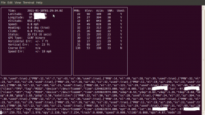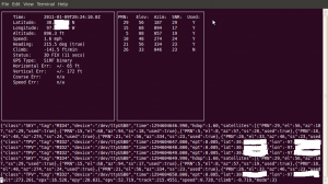 and get something useful. How will we know if we’re getting something useful? Just typing that at a command prompt starts gpsd and returns us to the shell. Well, the gpsd distribution includes some useful utility programs. gpspipe connects to gpsd and pipes the received data to standard output. xgps actually displays the GPS information, including the satellites, in a X window. We can also just telnet to the gpsd port and issue commands to gpsd from there. So let us experiment. Type