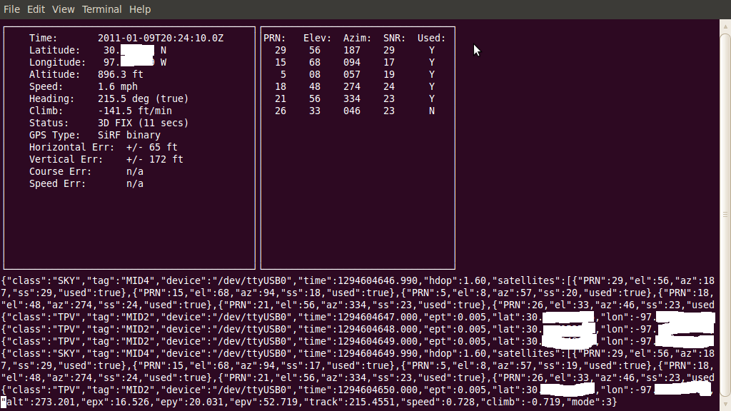 (Click to embiggen. The stuff at the bottom is the data that cpgs is getting from gpsd. Again, I’ve obscured the full lat/long coordinates for privacy.)