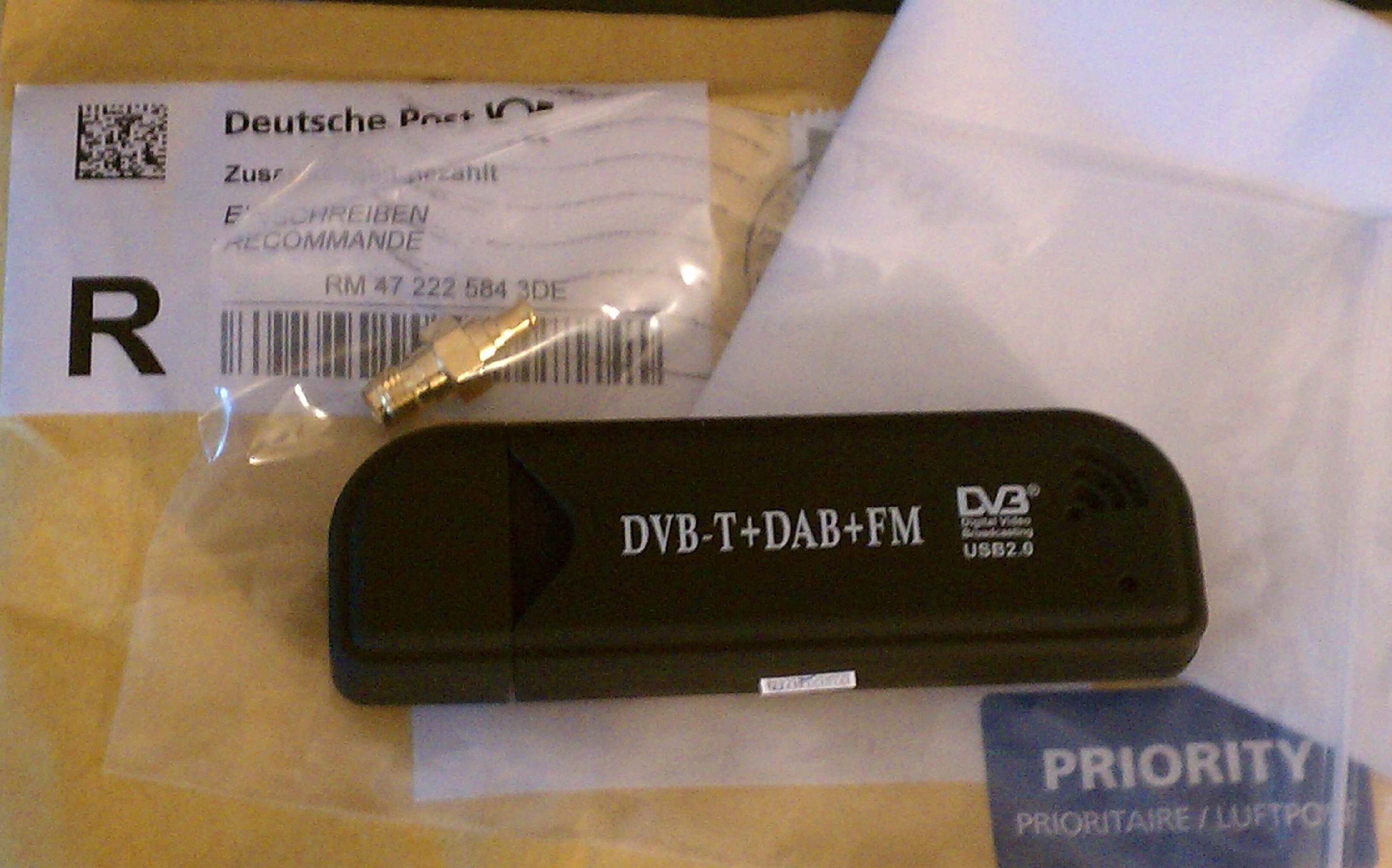 My USB TV receiver from Germany is here! (Previously.) More when and as I get a chance to dink with it.