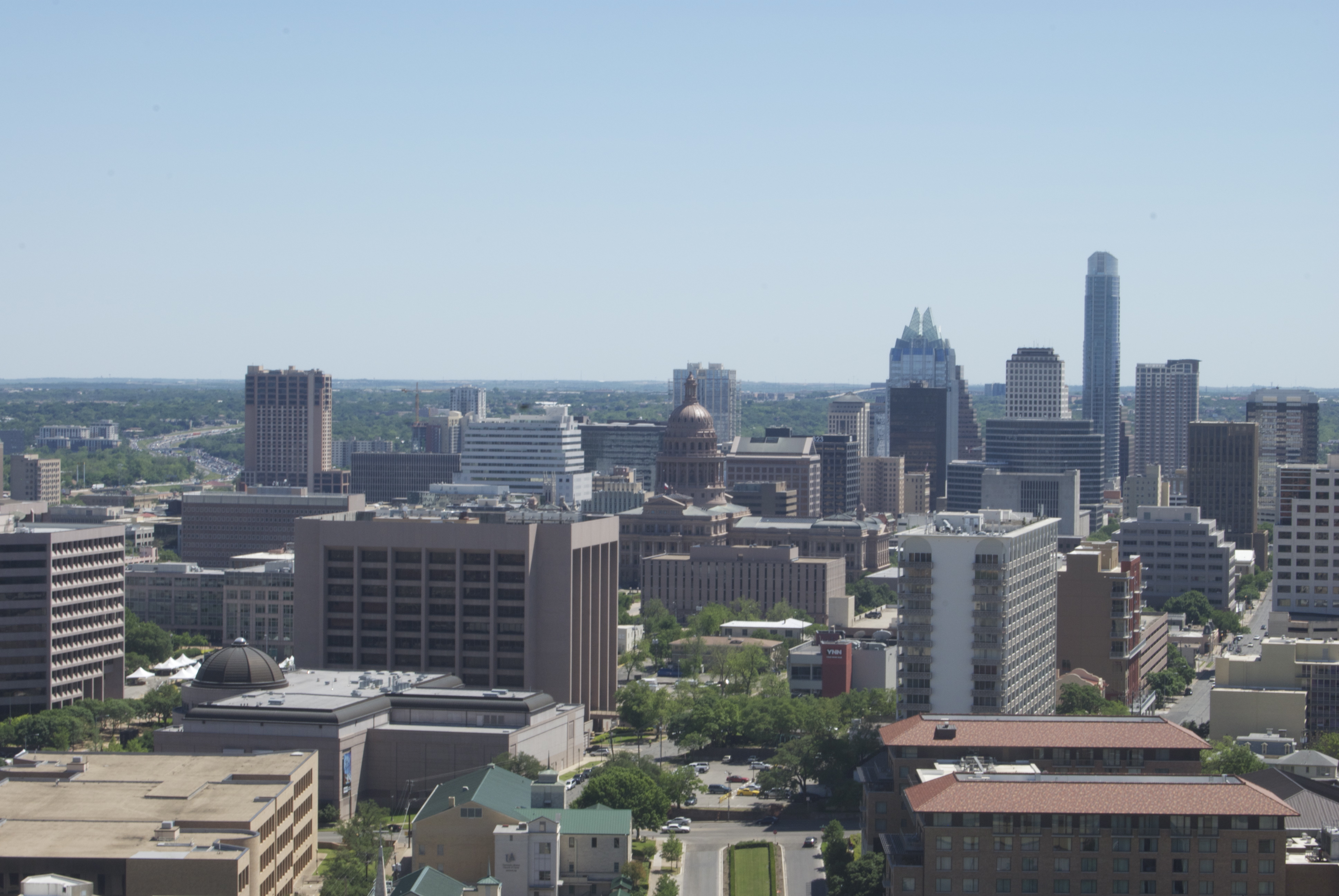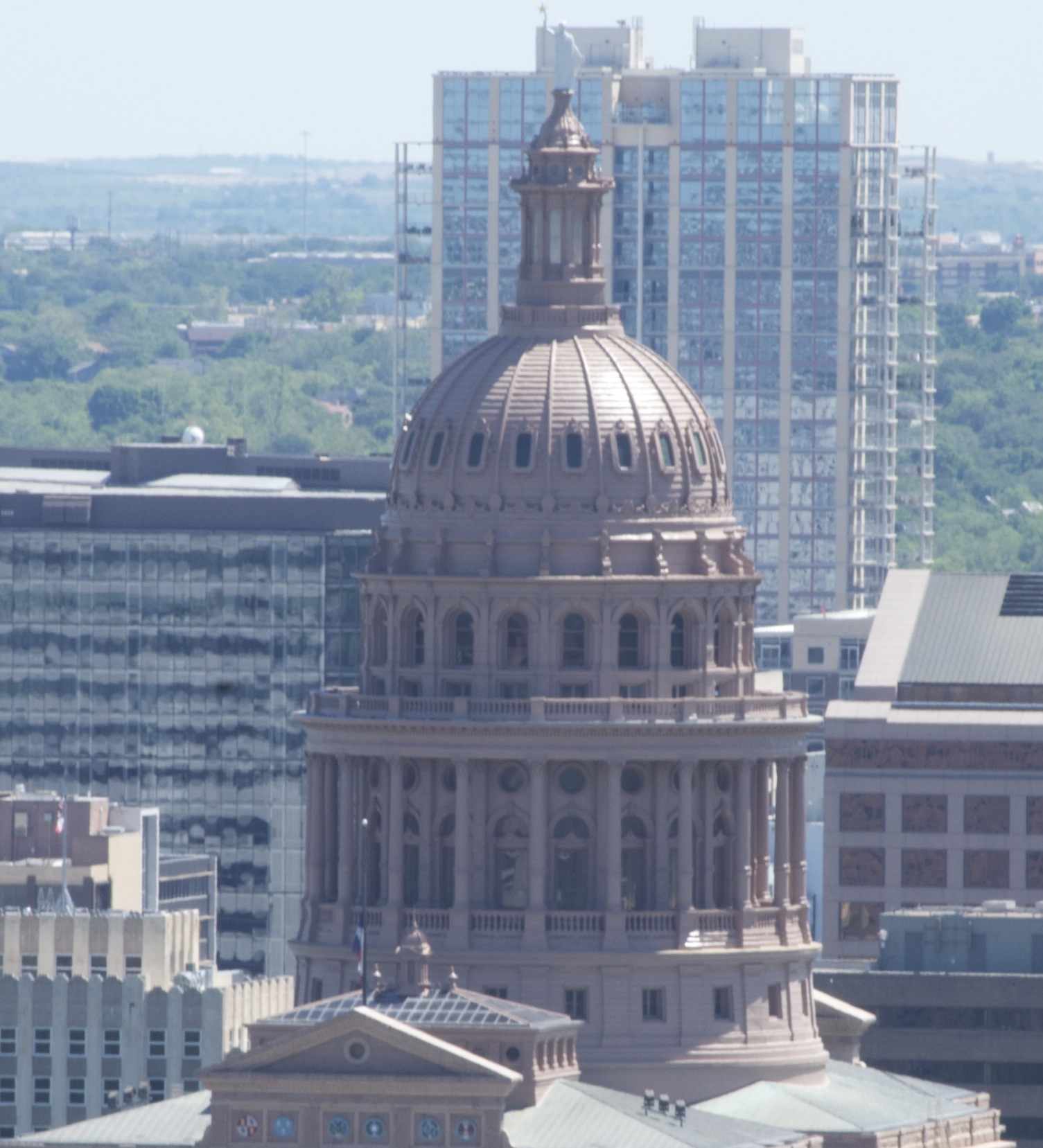 This is the Austin skyline, facing south from the 27th floor observation deck of the Main Building at the University of Texas. (Yes, that observation deck.) Taken at 1/60 and f/22, with the Nikon 55-200 VR zoom at 55mm. Just to the right of the Capitol, you can see the Frost Bank Tower, or as some of us like to call it, “the nose hair clippers”.